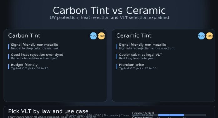 Selecting a window film is not just about achieving a darker look. If you value cabin comfort, keeping your upholstery from deterioration and safeguarding your skin, then the likelihood is that the actual comparison is carbon tint vs ceramic. Both enhance privacy and reduce glare, but they respond differently to heat, ultraviolet filtering and long-term durability. This guide explains how each film performs, what counts for UV protection and interior fade, and how to choose the right VLT for your car without sacrificing visibility or flouting local regulations.